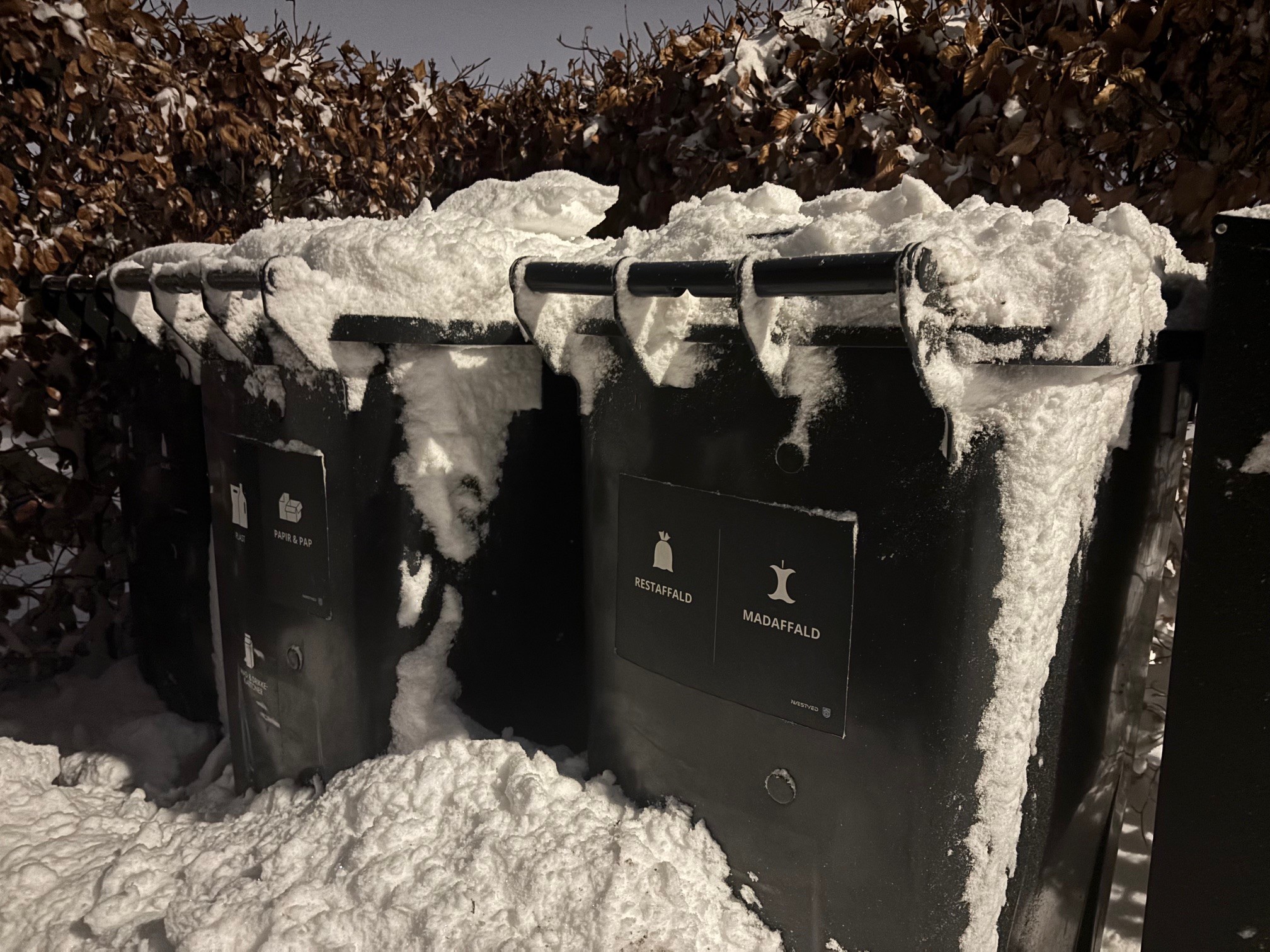 De store mængder sne kombineret med kraftige vindstød gør det vanskeligt for vores skraldemand at komme frem.